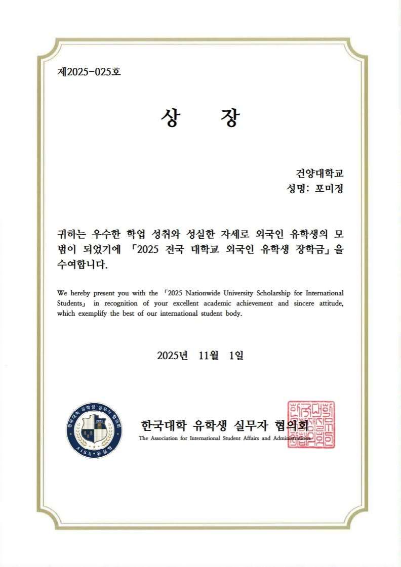 近日,bwin必赢中韩合作办学项目传来捷报:2022级项目员工鲍美婷赴合作院校韩国建阳大学留学期间,因学业成绩突出,斩获韩国大学职工事务管理协会颁发的“2025全国大学职工奖学金”。